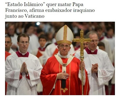 Estado Islâmico quer matar Papa Francisco em maio 19, 2015 Gerar link Facebook X Pinterest E-mail Outros aplicativos O estado Islâmico tem feito guerra a cristãos e prometeu decapitar todos que não se curvarem a sua religião. Comentários